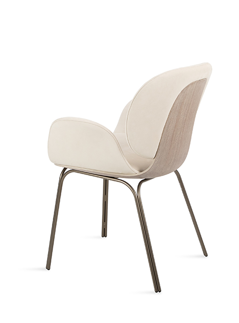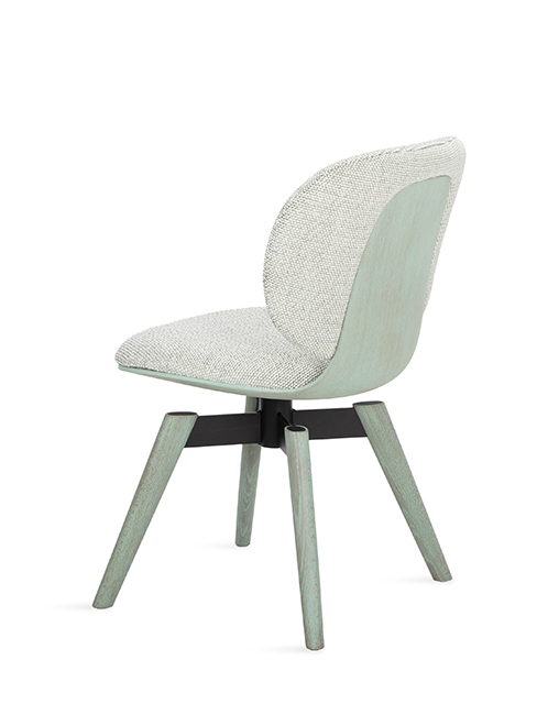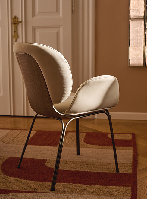 Designed for Freifrau, Ivy expands the portfolio with a line that, for the first time, features a visibly crafted wooden shell. Its floral design language defines the character of the chair and brings a new aesthetic to the Freifrau world – especially in the colored versions, which were created in cooperation with wood specialist Schotten & Hansen. Until now, wood was primarily used as a structural material at Freifrau – with Ivy, it becomes a central design element. The organically shaped shell, reminiscent of a flower, gives the chair an elegant, calm aura. This is made possible by an innovative structure, developed specifically for Ivy: At the core, molded wood wool provides stability and flexibility. High-quality oak veneer refines the surface. The wood wool inside the shell, combined with the precious veneer, enables complex, three-dimensional shapes, creates a springy effect, and thus supports the chair's ergonomic properties. "We wanted to create a shell that, through its shape and surface, clearly stands out from our previous models," says Managing Director Marc Helweg. "Sebastian Herkner succeeded in implementing precisely this requirement in his design – while also meeting our comfort and quality requirements with a high level of sophistication." Herkner adds: